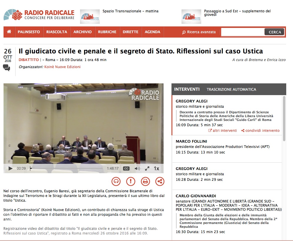 26.10.2016 – Radio Radicale. “Il giudicato civile e penale e il segreto di Stato. Riflessioni sul caso Ustica” di su in Video https://www.radioradicale.it/scheda/490351/il-giudicato-civile-e-penale-e-il-segreto-di-stato-riflessioni-sul-caso-ustica?i=3626085 https://www.radioradicale.it/scheda/490351/il-giudicato-civile-e-penale-e-il-segreto-di-stato-riflessioni-sul-caso-ustica?i=3626093 Continua a leggere Articolo precedente 31.10.2016 – Radio Cusano Campus: “Intervista a Eugenio Baresi autore del libro “Ustica Storia e Controstoria”.Articolo successivo 11.11.2016 – Radio Radicale. “Presentazione del libro “Ustica. Storia e Controstoria” di Eugenio Baresi