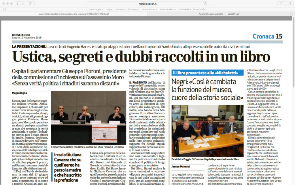 12.11.2016 – Marsilioeditori – Bresciaoggi: “Ustica, segreti e dubbi raccolti in un libro”. di su in Articoli http://www.marsilioeditori.it/media/rassegna_stampa/bro16b123172420.pdf Continua a leggere Articolo precedente 12.11.2016 – Corriere della Sera ed.Brescia: “Ustica,non fu missile. La pista? Mediorientale”.Articolo successivo 12.11.2016 – Giornale di Brescia: “Ustica, storia di intrighi e di perizie tinte di giallo”.