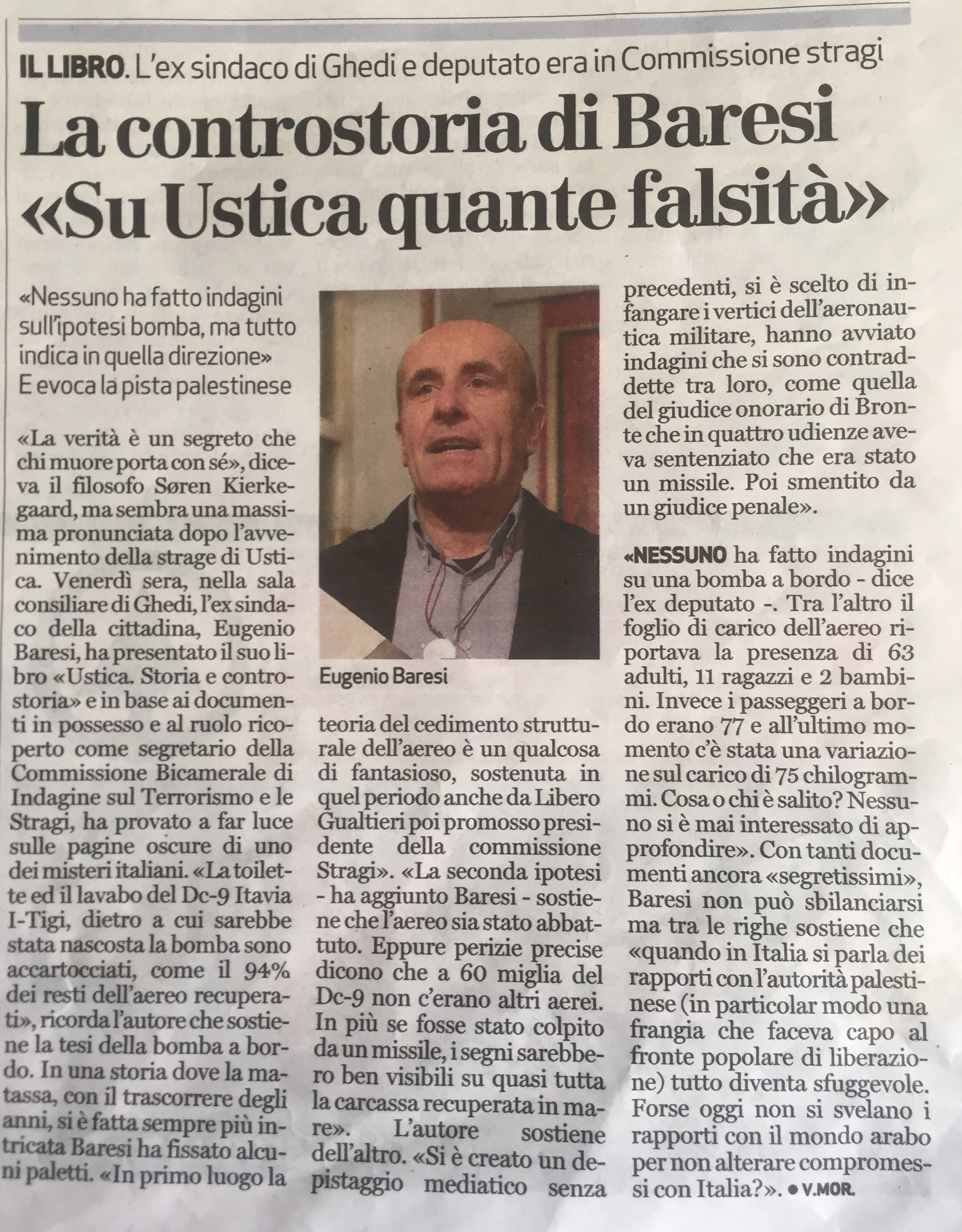 12.03.2017 – Bresciaoggi: ” La controstoria di Baresi. Su Ustica quante falsità”. di su in Articoli Continua a leggere Articolo precedente 04.03.2017 – “La mafia dell’antimafia prima parte”Articolo successivo 30.03.2017 – Montichiariweek: ” Rivelazioni su Ustica. L’ex sindaco presenta il suo libro”.