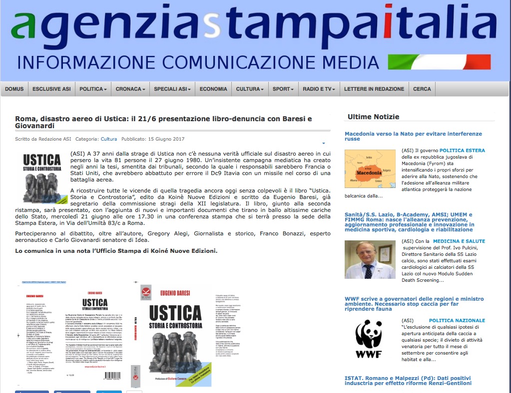 15.6.2017 – Agenzia Stampa Italia: ” Roma, disastro aereo di Ustica: il 21/6 presentazione libro-denuncia con Baresi e Giovanardi. di su in Articoli http://agenziastampaitalia.it/cultura/cultura-2/34184-roma-disastro-aereo-di-ustica-il-21-6-presentazione-libro-denuncia-con-baresi-e-giovanardi Continua a leggere Articolo precedente Le Iene fanno solo danni per la loro incapacità o…?Articolo successivo 20.06.2017 – Stampa Estera Italia: Ustica, Storia e Controstoria. Presentazione Libro.