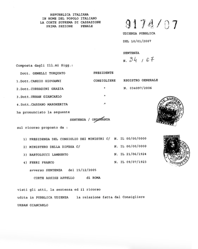 tutti gli aerei militari italiani erano a terra, che i missili di dotazione italiana erano nei loro depositi, che gli aerei militari alleati non si trovavano nella zona del disastro e che nell’ora e nel luogo del disastro non vi erano velivoli di alcun genere”.