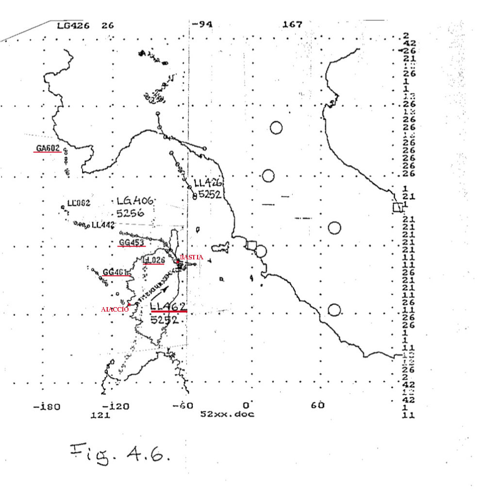 GG453. Nasce alle 19.23.69 come AA con codice di SIF3=2165 per divenire subito dopo GG453. Da Nord della Corsica procede verso Sud. Alle 19.26.14 assume codice SIF3=5200. Intorno alle 19.37 scade di qualità e non è più riportata. Da notare che non ha mai dati di quota e alle ultime battute è a bassa velocità (162Kts). Non può essere un elicottero a causa delle velocità iniziali (quasi 500Kts). Non è registrata da Fiumicino pur essendo all’interno della portata radar, e quindi è sicuramente a bassa quota almeno nella parte terminale della traiettoria.