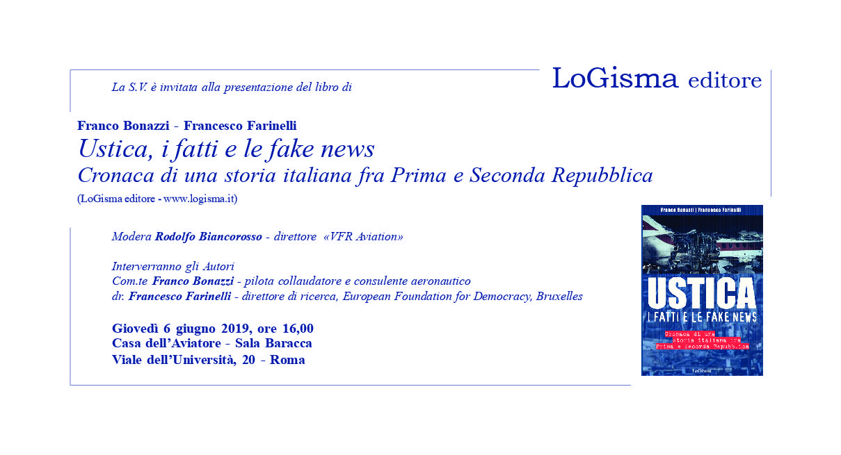 GIOVEDÌ 6 GIUGNO 2019 ORE 16,00 presso la CASA DELL’AVIATORE – VIALE DELL’UNIVERSITÀ, 20 ROMA si presenta il libro Franco Bonazzi – Francesco Farinelli USTICA, I FATTI E LE… [Continua a leggere]